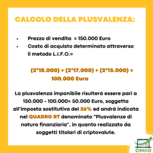 Pertanto per determinare la plusvalenza tassabile derivante da cessione di criptovalute, una volta verificato il superamento della soglia di giacenza massima pari ad euro 51.645.69 detenuta su tutti i wallet, si andrà ad indicare nel quadro RT del modello dei Redditi delle P.F. la differenza tra: